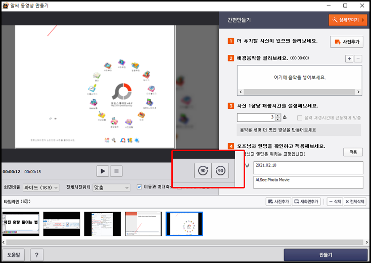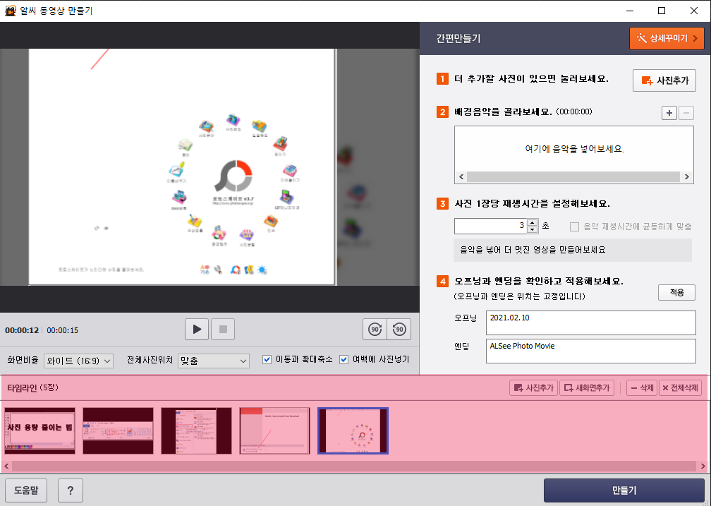 직접 알씨 동영상만들기 프로그램을 이용을 해서 제작을 하여 보시면 근방 제작을 할 수가 있습니다. 참고를 해서 원하는 멋진 동영상 제작을 하여 보세요!