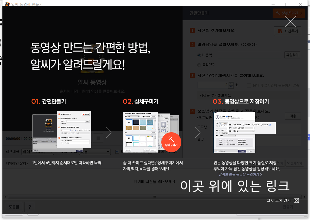 필요가 없다면 다시 보지 않기를 클릭하여 주세요! 이제 어떻게 알씨 동영상만들기를 이용을 해서 멋진 동영상을 만들수가 있는지 알아보겠습니다.
