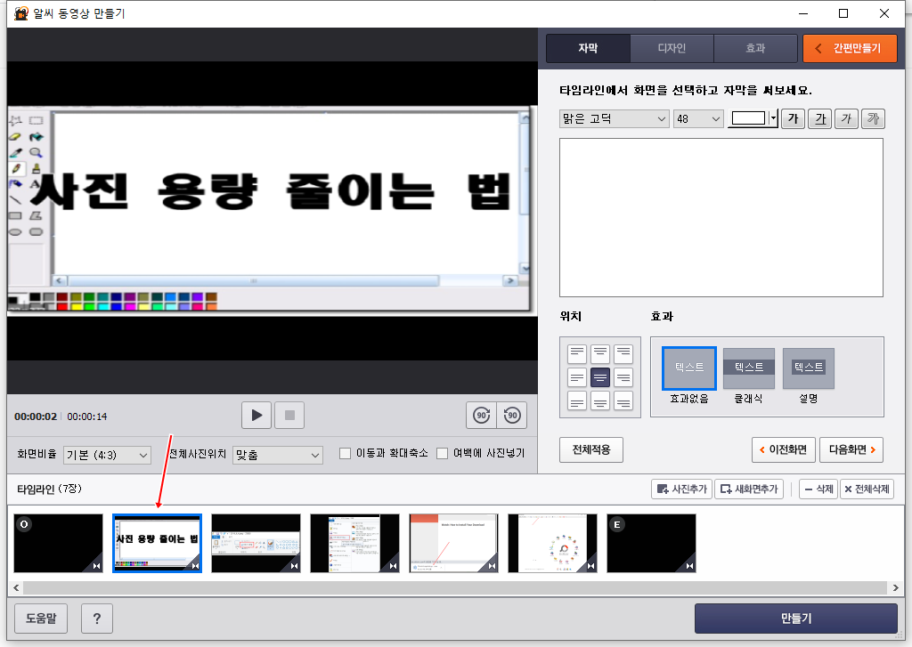 타임라인에 있는 사진중에 연출을 하고 싶은 사진을 선택하고 디자인 효과 등을 적용을 하여 보세요! 그리고 만들기를 하시면 동영상을 제작을 할 수가 있습니다.