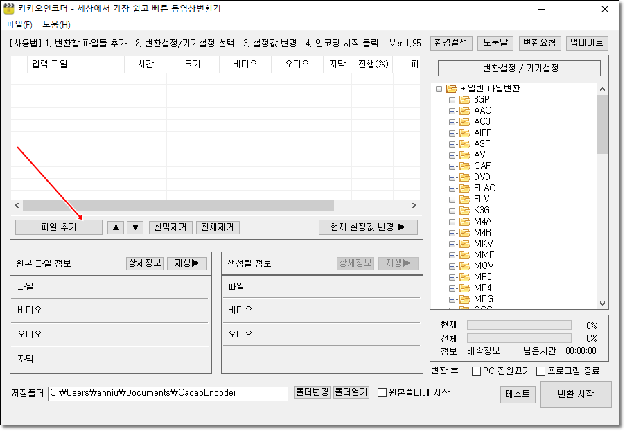 1. 파일추가 버튼을 클릭해서 동영상 용량을 줄이고자하는 파일을 가지고 오세요!