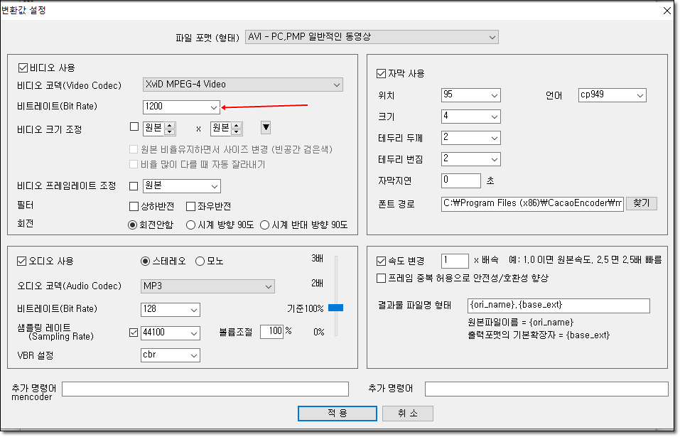 4.비트레이트 버튼이 있습니다. 클릭을 해서 현재 설정값 보다 낮은 값을 설정을 하여주세요! 너무 낮으면 화질이 너무 좋지가 않습니다.