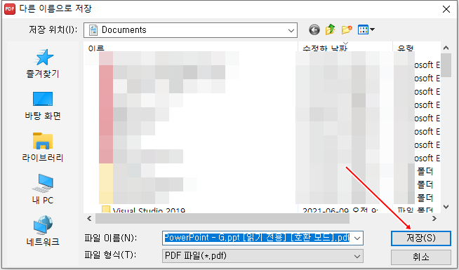 4. 원하는 이름을 지정을 하고 저장 버튼을 클릭하시면 PDF변환이 됩니다.