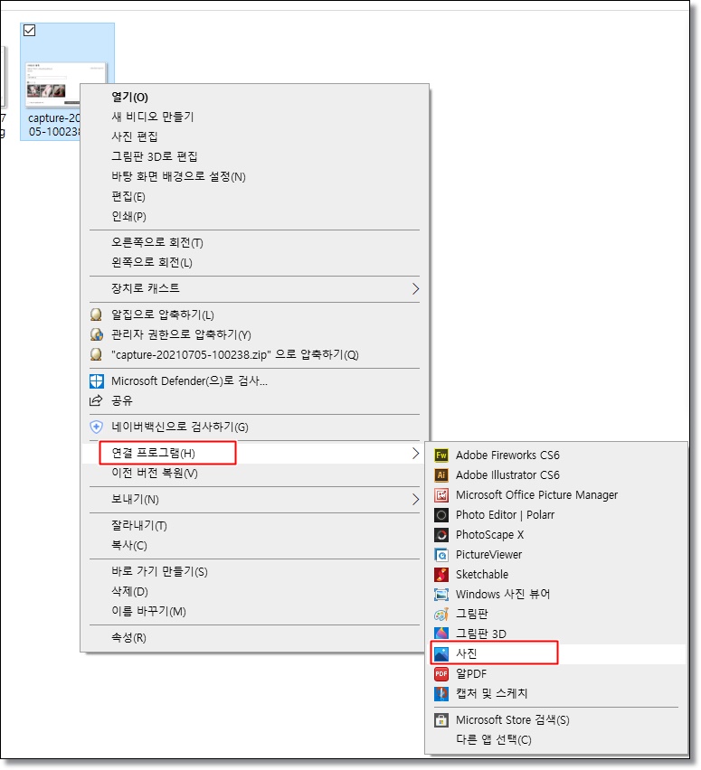 3. 도구가 있다면 편환을 하고자 하는 JPG 파일을 오른쪽 클릭을 해서 연결프로그램 > 사진 메뉴를 차례로 클릭하세요!