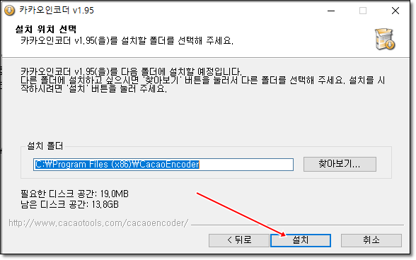 8. MP4 파일을 MP3로 변환을 할 수가 있는 프로그램을 설치를 할 수가 있는 카카오인코더를 설치할 폴더를 지정을 하고 설치 버튼을 클릭을 하여주세요!