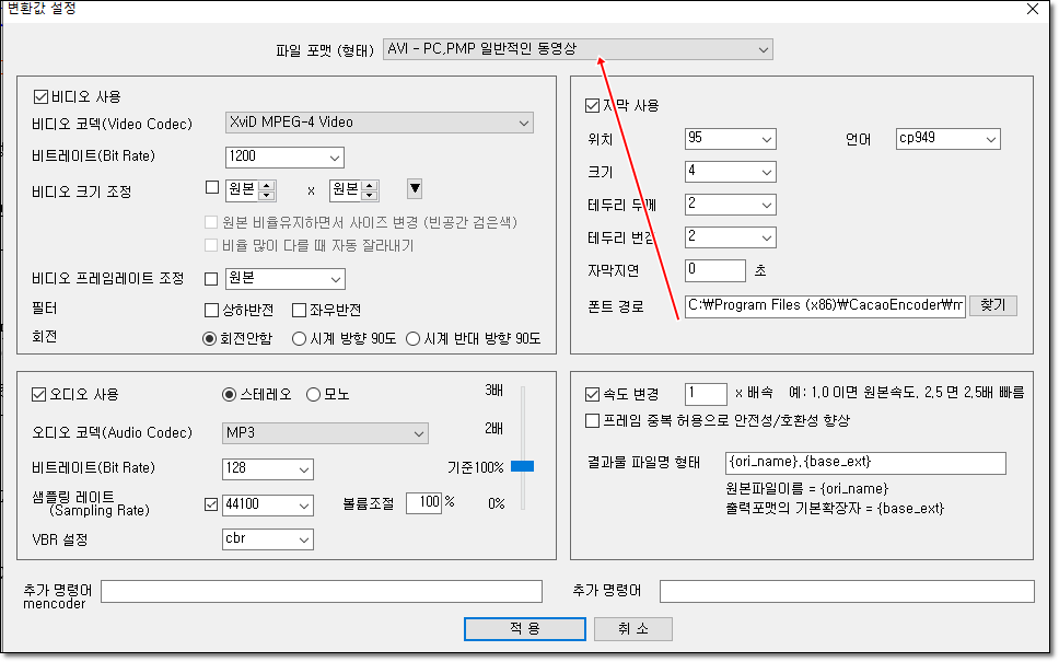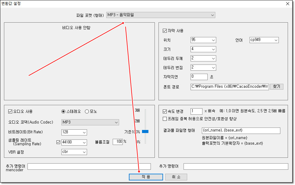 4. MP3 형식으로 변경을 하여주세요! 그리고 적용 버튼을 클릭하세요!