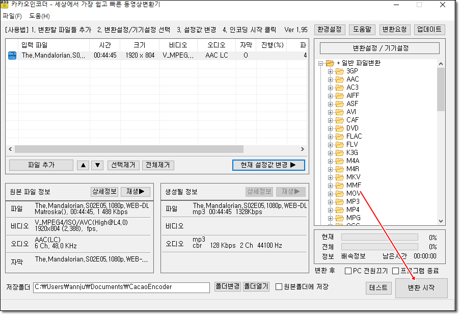 5. 이제 MP4 형식을 MP3 파일 형식으로 변환을 하기 위해서 변환시작 버튼을 클릭하세요!