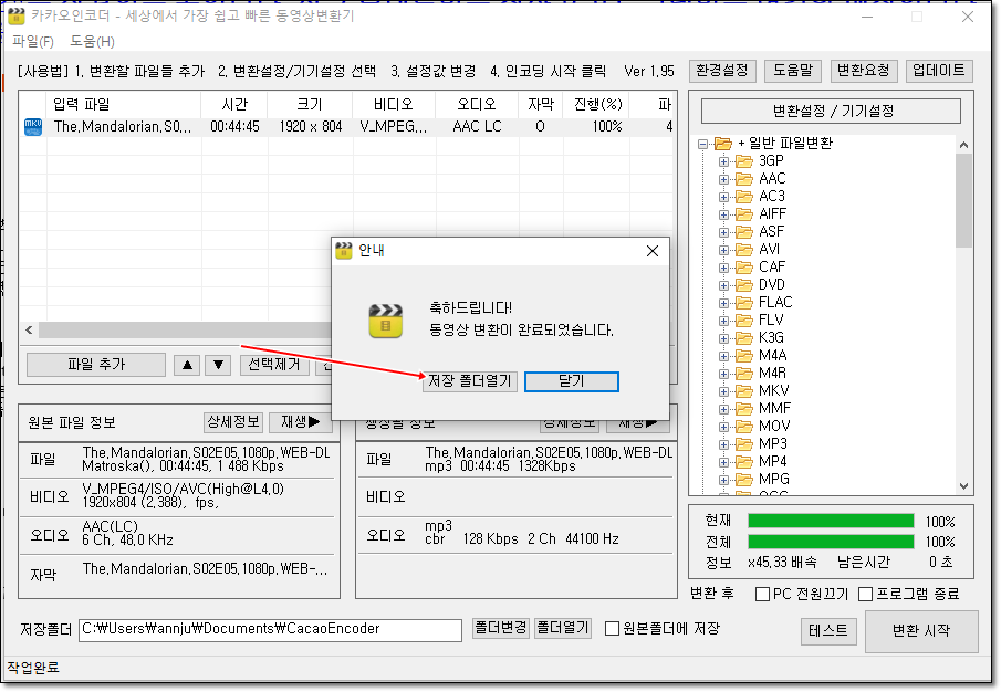 7.MP4>MP3 변환이 완료가 되면 위와 같이 안내 창이 표시가 됩니다. 저장 폴더 열기 버튼을 클릭을 하여주세요!