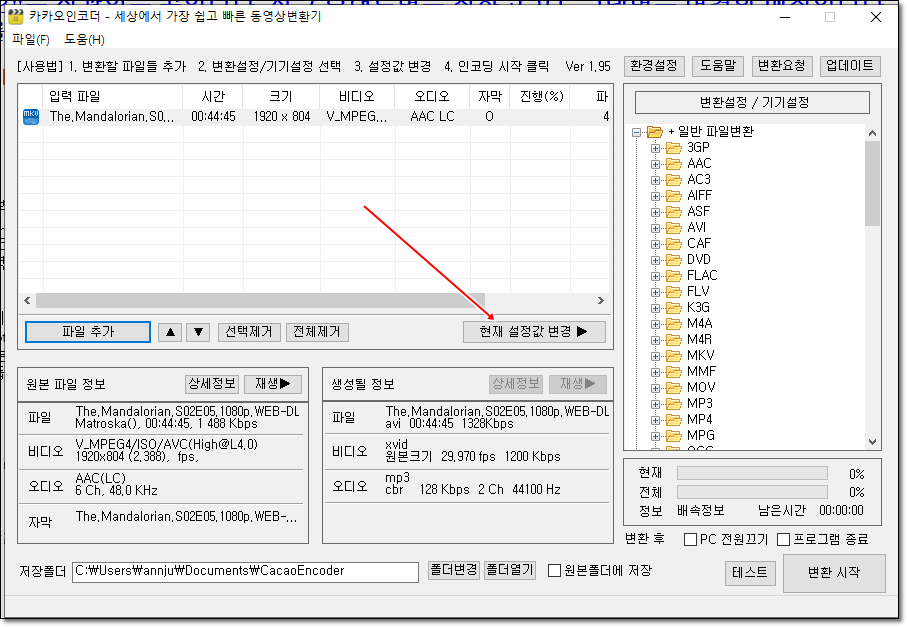 2. MP3로 변환 할 파일을 가지고 왔다면 현재 설정값 변경 버튼을 클릭하세요!