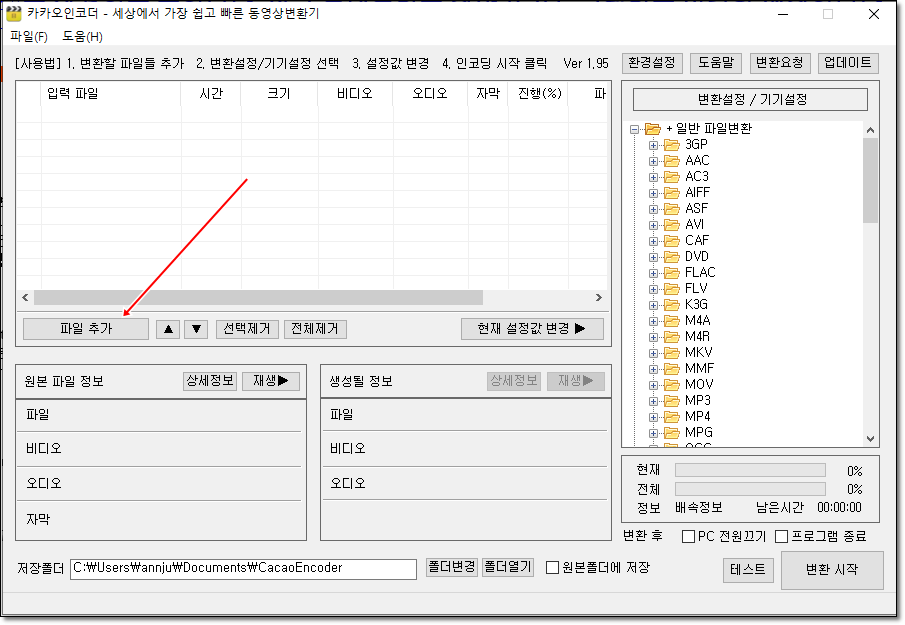 1. 실행이 되면 파일추가 버튼을 클릭을 해서 MP4 파일을 가지고 오세요!