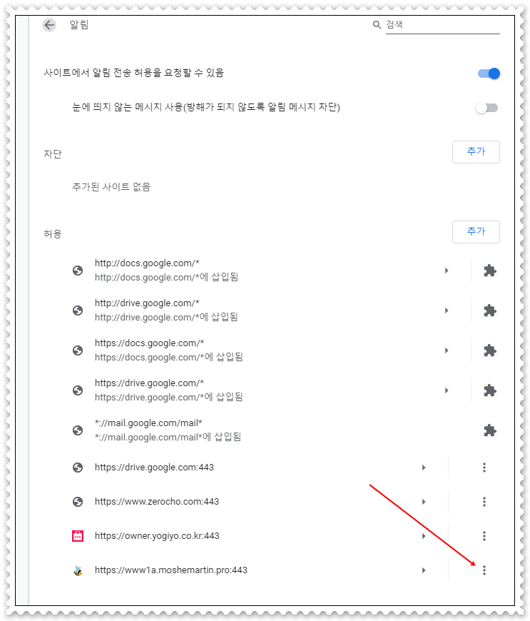 7. 허용목록에 보시면 구글에서 삽입된 사이트 와 본인이 직접 허용한 사이트가 있다면 해당 사이트 때문에 알림 광고창이 생성이 되는 경우가 많습니다.