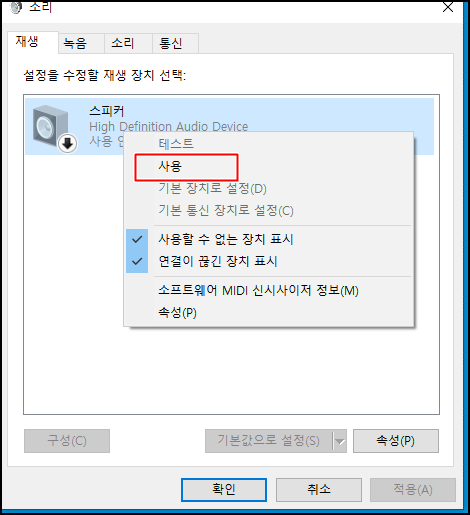 간혹 실수로 스피커 장치를 사용안함으로 설정이 되어서 스피커 장치가 동작을 하지 않는 경우가 있습니다. 이런 경우에는 스피커 장치를 다시 사용으로 설정을 해야 합니다.