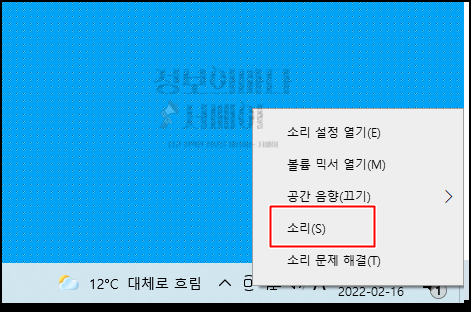 1. 작업표시줄에 있는 스피커 아이콘을 오른쪽 클릭을 하여주세요! 그리고 [ 소리 ] 메뉴를 클릭하세요!