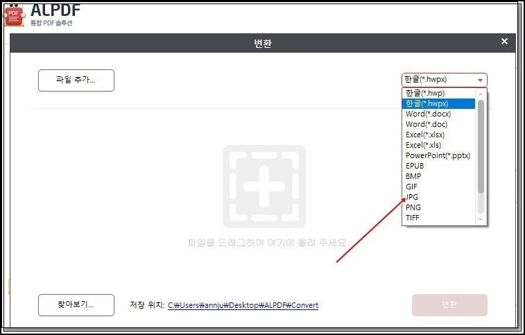 - 화면 오른쪽 상단에 보이는 변환 형식을 선택하는 드롭다운 버튼을 클릭해 JPG로 변경하세요.