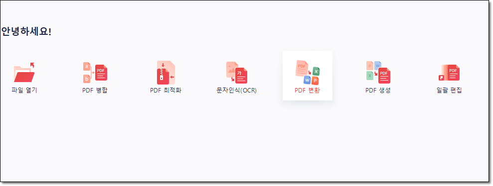 알pdf 프로그램을 실행하면 간단한 인터페이스가 나옵니다. 여기에서 pdf파일을 한글파일로 변환하기 위해 'pdf 변환' 메뉴를 선택해주세요.