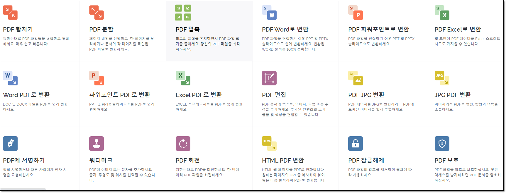 아이러브pdf 웹사이트에서는 회원가입 없이도 pdf 관련 20여 가지 작업을 할 수 있습니다. 웹사이트에 접속하면 각종 기능들이 보이므로, 원하는 작업을 선택하시면 됩니다.
