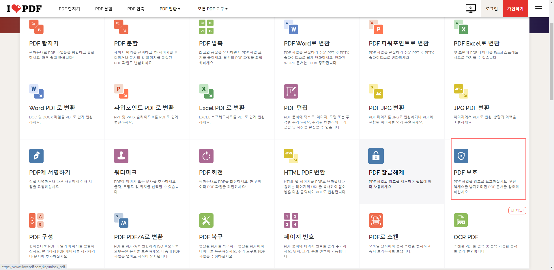 - ilovepdf 웹사이트로 이동하여 메인 페이지의 오른쪽 하단 모서리에 있는 "PDF 보호"를 클릭합니다.