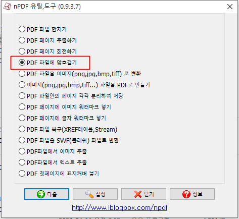 - "PDF 파일에 암호 입력"을 선택하고 "다음" 버튼을 클릭합니다.