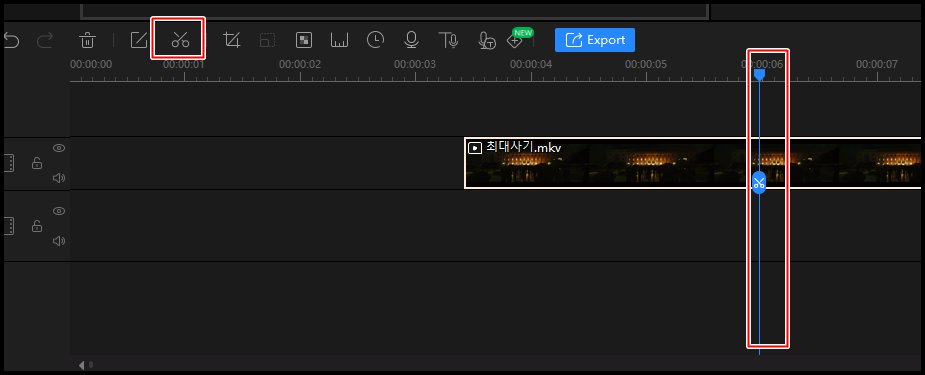 3.동영상 파일이 불러와지면, 타임라인 또는 시간바를 이용하여 자를 범위를 설정합니다.