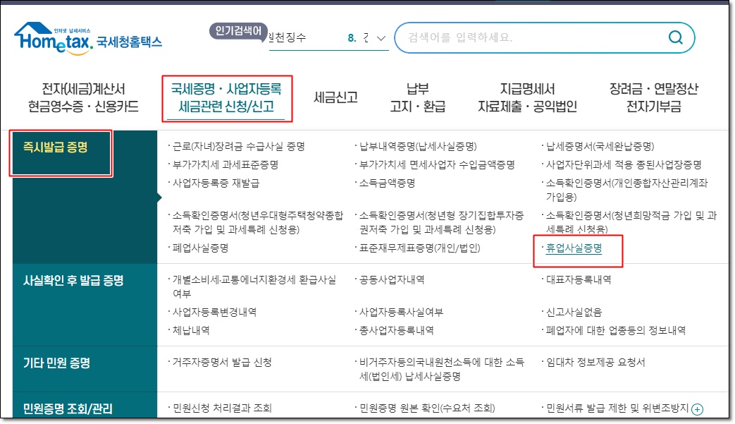[국세증명. 사업자등록 세금관련 신청/신고] 섹션에서 "즉시발급 증명" 또는 유사한 항목을 찾아 클릭합니다.