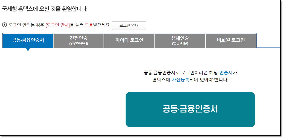 홈택스 홈페이지에 접속하면 화면 상단이나 중앙에 로그인 영역이 나타납니다. 여기서 공동인증서 또는 공인인증서를 통해 로그인합니다.
