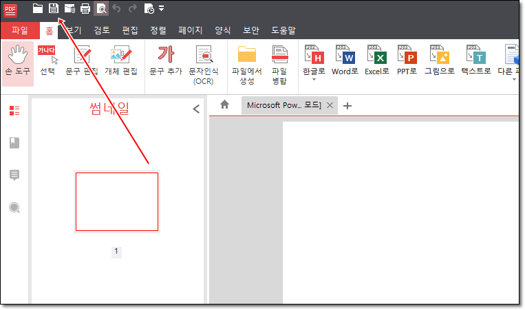 파일이 열리면 PDF파일로 변환을 하기 위해서 상단의 저장 아이콘을 클릭하세요!