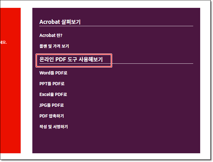 - 화면을 스크롤하여 "온라인 PDF 도구 사용해보기" 항목중에 하나를 클릭하세요!