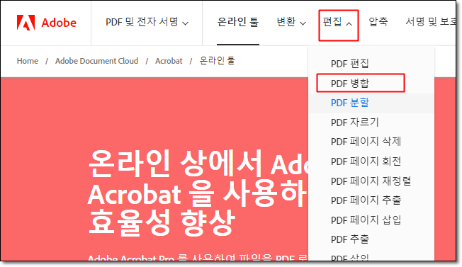 - 이 페이지로 이동한 후 상단의 "편집" 메뉴에서 "PDF 병합"을 선택하세요.